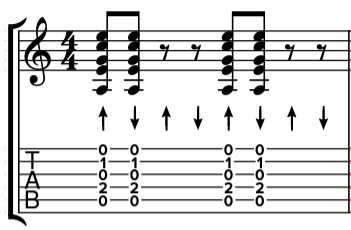 Par rapport au précédent, 2 coups de médiator ont été ajoutés : sur le et avant le 3 et sur le 4. Les seuls coups non joués sont le 2 et le et après le 4 et le 1.