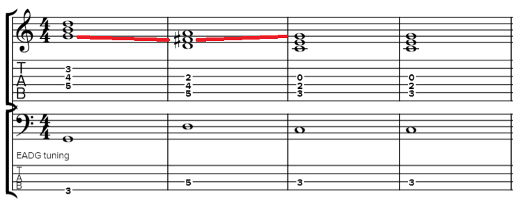Reprenons les 3 accords du paragraphe précédent. Le passage de l’accord G à celui de D, nous avons :