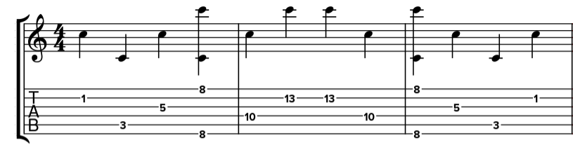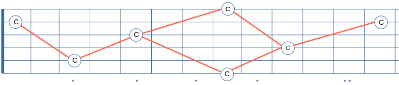 Ici, on se servira su système CAGED pour repérer les notes sur le manche, en procédant par section du manche, et en avançant jusqu’à avoir bouclé une octave.