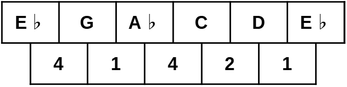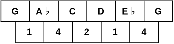 Cette gamme est pentatonique, et contient donc 5 notes, 5 intervalles :