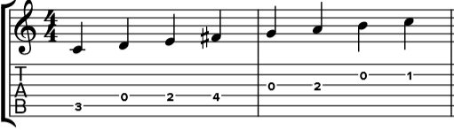En C, le mode lydien s’écrit et se joue comme ceci :